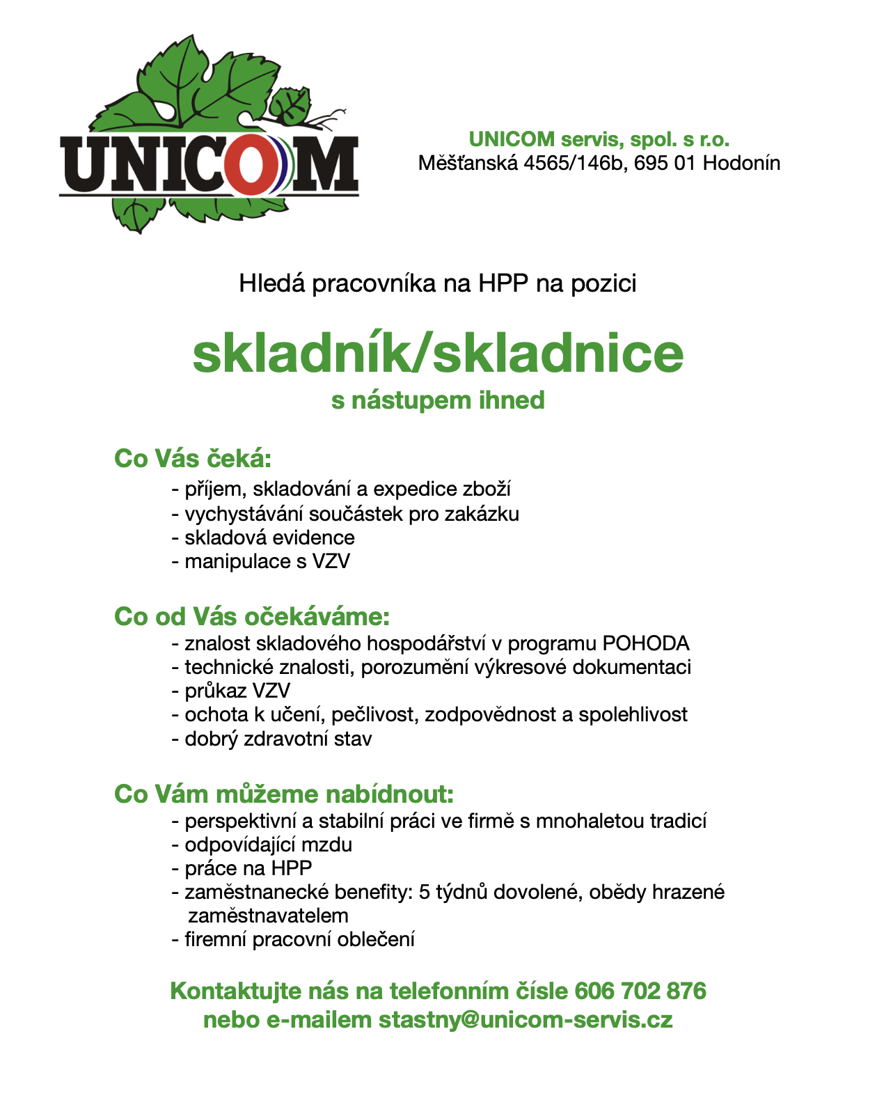 Naše firma hledá pracovníka na hlavní pracovní poměr na pozici skladník/skladnice s nástupem možným ihned. Chcete být součástí perspektivní a stabilní firmy s mnohaletou tradicí? Ozvěte se nám na telefonní číslo 606 702 876 nebo e-mailem na adresu stastny@unicom-servis.cz.